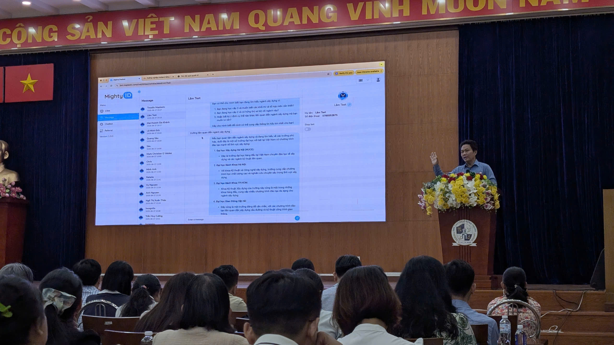 Tại hội thảo, Maple STC – đơn vị tiên phong trong lĩnh vực chuyển đổi số giáo dục và ứng dụng trí tuệ nhân tạo (AI) – được mời tham dự với vai trò chuyên gia giải pháp công nghệ, chia sẻ mô hình AI Chatbot hướng nghiệp và tuyển sinh do Maple STC phát triển.